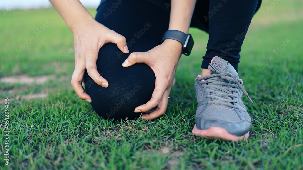Knees injury accident in sport exercise running jogging.sprain or cramp Overtrained injured person when training exercising or running outdoors. #351209466