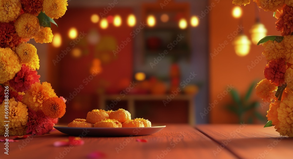Laddu Dessert on Plate With Floral Garland Decorations for Diwali Celebration. #1698888526