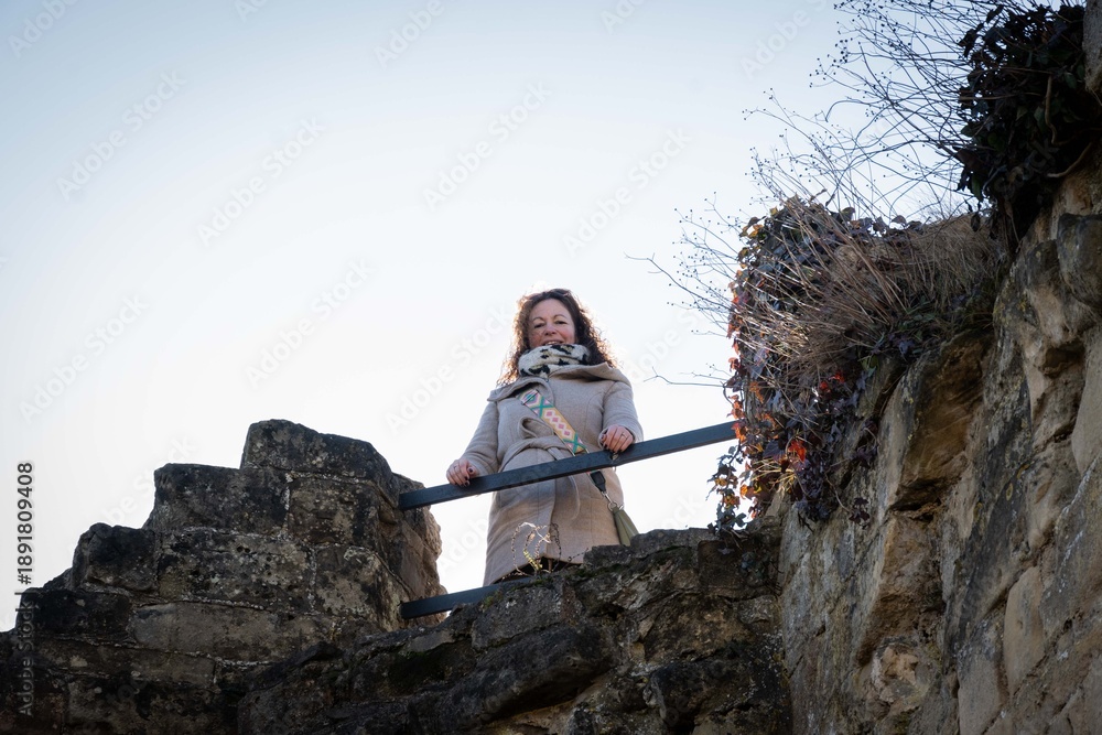 lady standing ruins of medieval Dutch hilltop Castle Valkenburg aan de Geul, Limburg, Netherlands. Historic landmark monument popular tourist educational attraction for sightseeing #1891809408