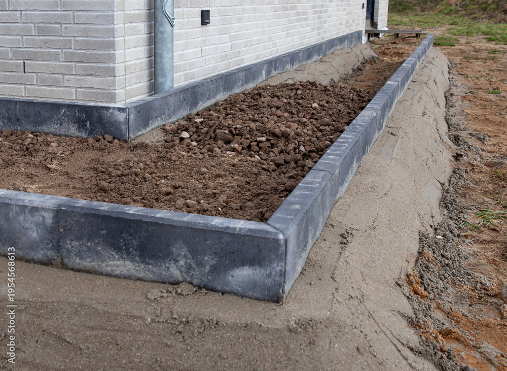 Landscape construction featuring a newly built concrete border surrounding a dirt-filled garden bed next to a modern brick house under clear sky #1954568613