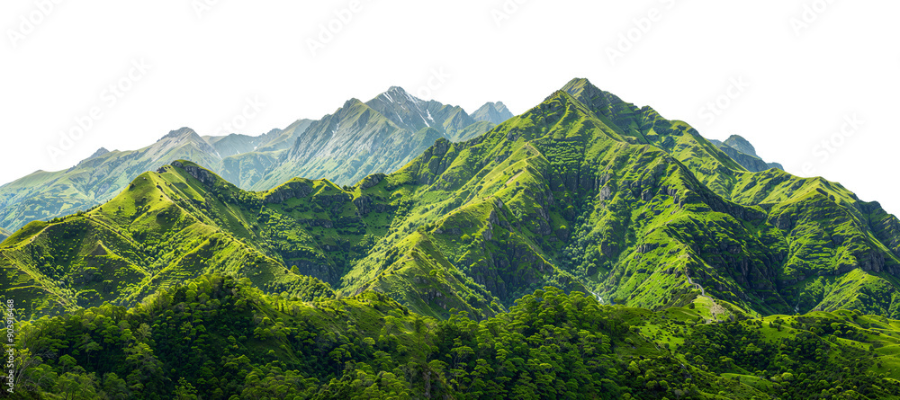 Landscape with mountains, lush green vegetation, isolated on a transparent background #903916468