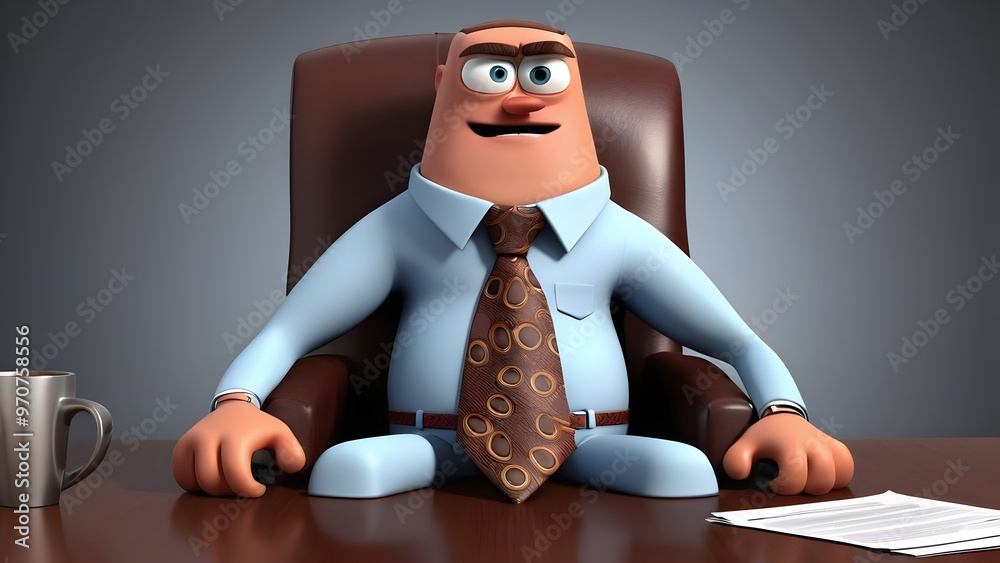 large, bold-patterned necktie character with a stiff, exaggerated collar, acting like the boss. It’s sitting in a huge leather chair at a desk, holding a tiny coffee cup with one end of the tie and #970758556