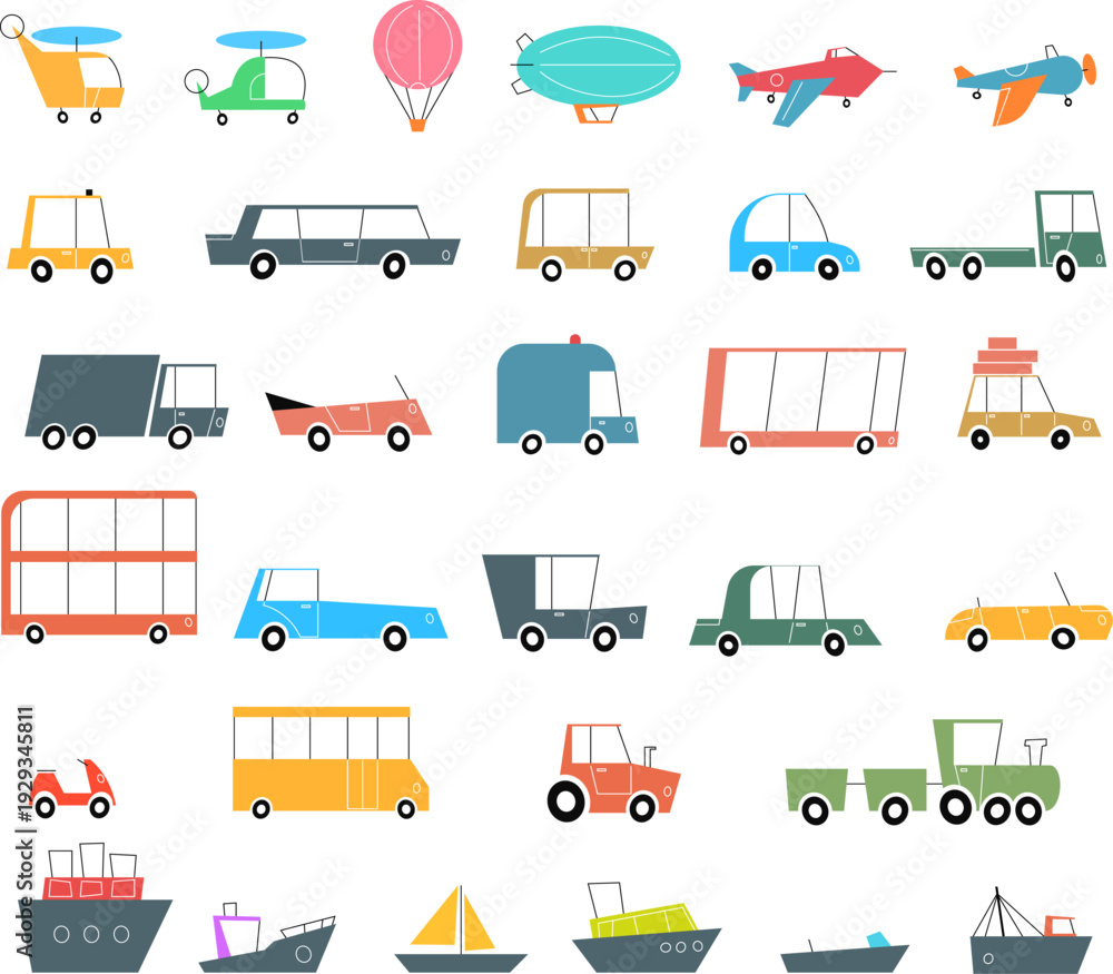 Large collection of stylized air, road and water transportation icons for child book, kids decoration, game, travel and logistics projects. Minimalist flat vector illustration in retro mid century mod #1929345811