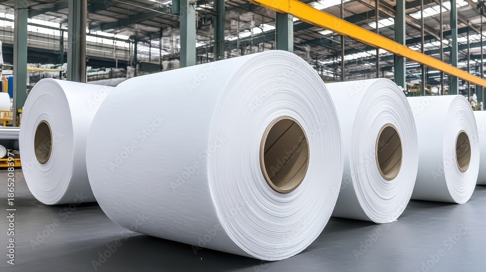 Large industrial sized rolls of white absorbent material stored indoors on a factory floor #1865208397