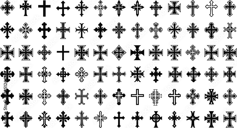Large set of various ornate Christian cross icons and decorative religious crucifix symbols in black silhouette vector style for church design, spiritual faith and historical graphics. #1951264671