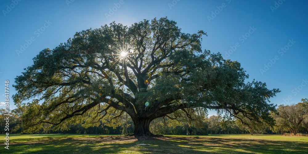 Large southern live oak tree over 300 years old at a historic park, emphasizing preservation efforts, Earth Day #1818417748