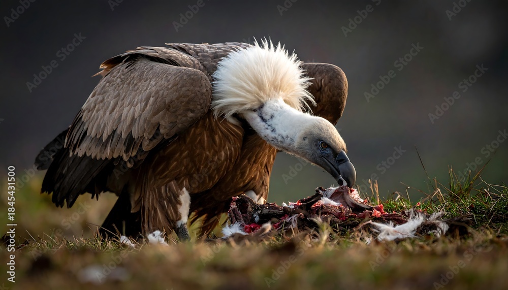 Large vulture with beige plumage feasts on animal carcass in a grassy field, bokeh background #1845431500