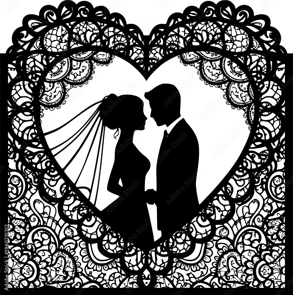 Laser cut template of wedding invitation, bride and groom in the heart frame. Openwork silhouette vector card. Couple in love in lace decor panel. Faces in profile at Valentine's day. Pattern cut out #1960231312