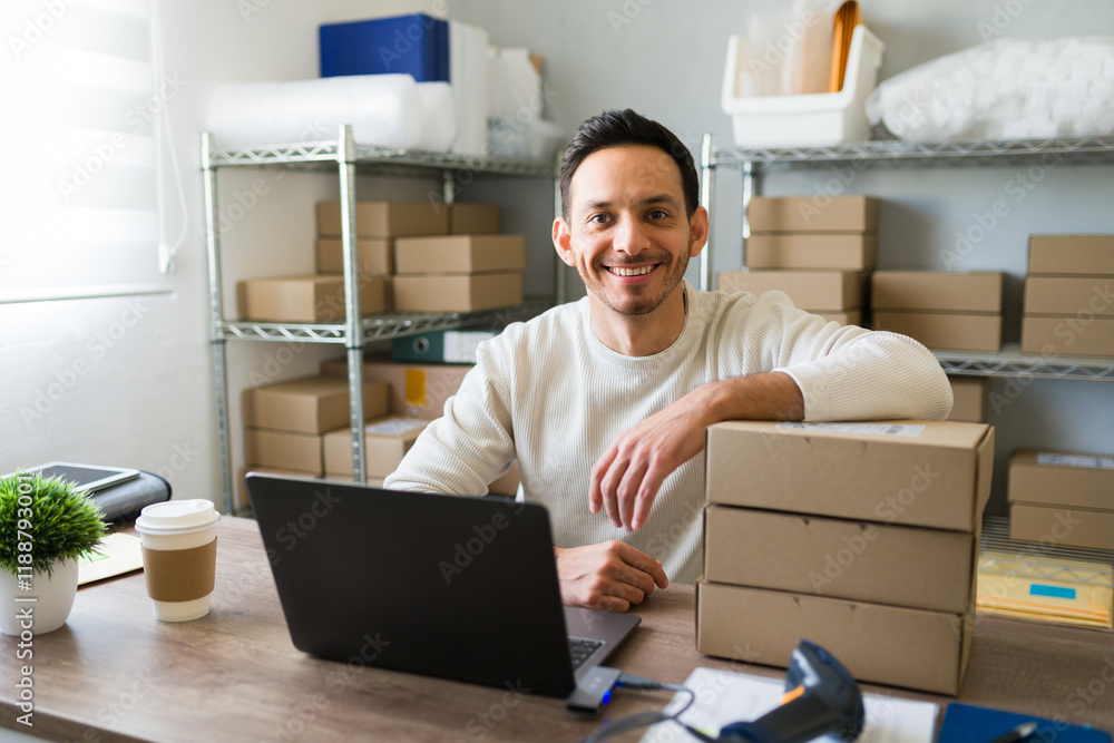 Latino entrepreneur joyfully fulfilling shipping orders from his home office with a laptop and barcode scanner #1188793001