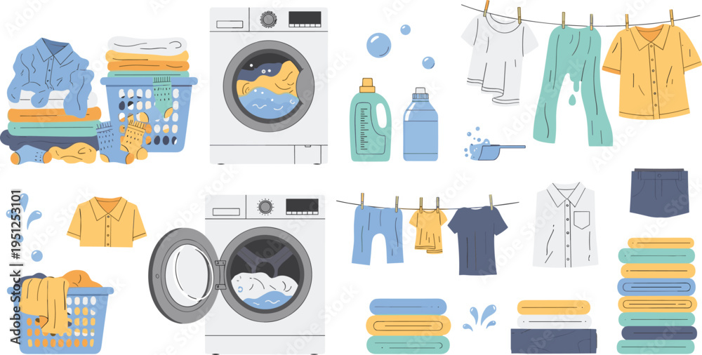Laundry and Washing Clothes Set with Washing Machine, Detergent, Clothesline and Folded Garments, Household Cleaning Elements for Home Care and Daily Routine Design #1951253101