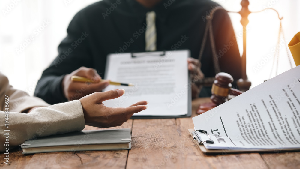 Lawyer discussing legal contract with client in office, providing advice and consultation. Scales of justice and gavel on desk #1744348627