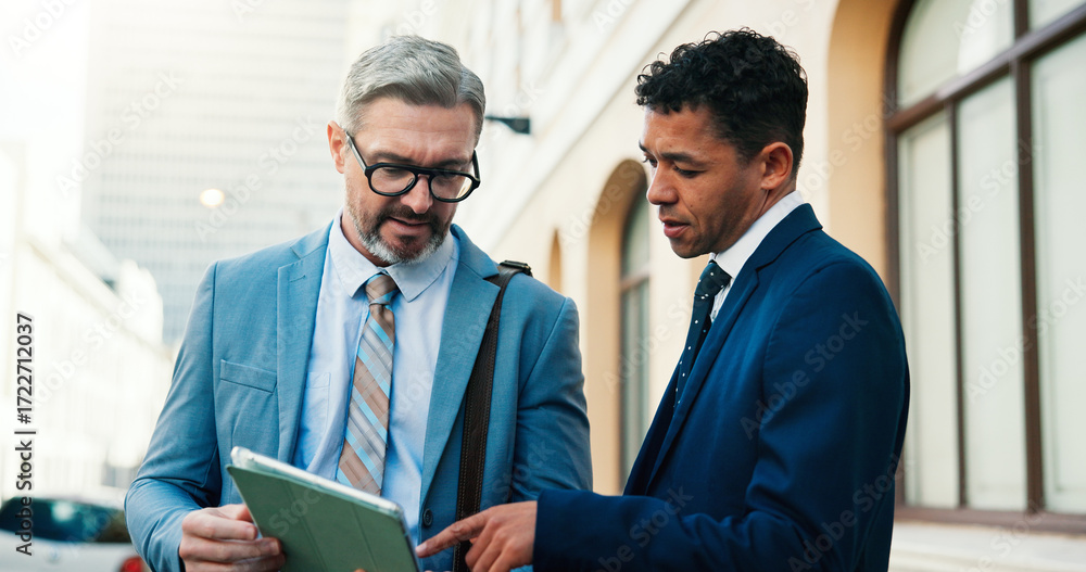 Lawyers, men and tablet outdoor with discussion for court preparation, litigation or legislation online. Review case notes, team or people in city with tech, trial meeting or ready for legal hearing #1722712037