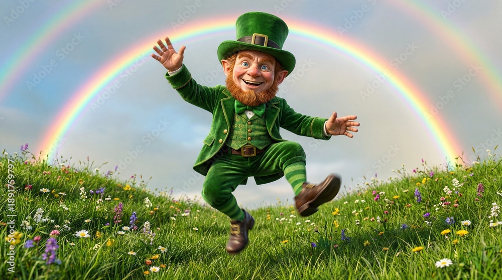 Leprechaun dancing joyfully under rainbow in green meadow. St. Patricks Day mythical Irish folklore character celebrating luck and holiday tradition. Dynamic 4k fantasy scene with vibrant colors and #1891759797