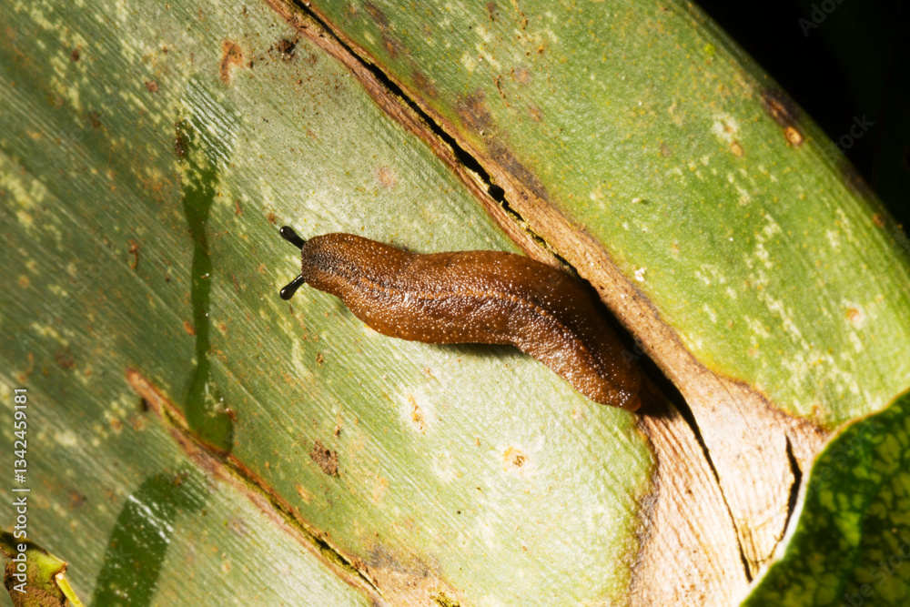 Lesma andando sobre superfície de folha de planta nativa da Mata Atlântica. #1342459181
