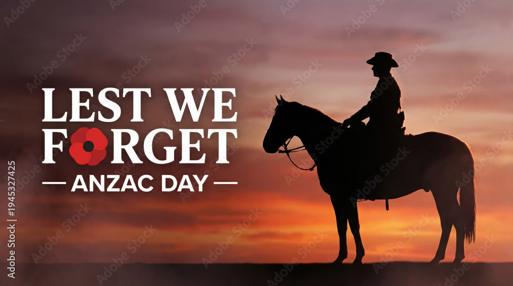 Lest we forget. ANZAC Day silhouette of mounted soldier at sunrise for Remembrance Day. #1945327425