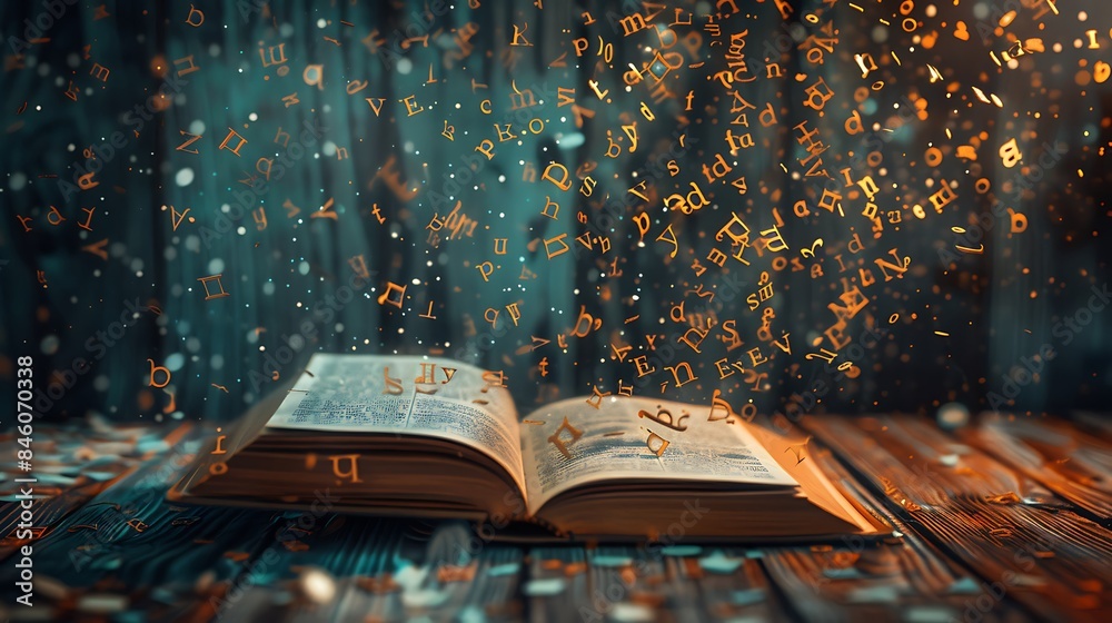Letters flying out from open book on wooden table bokeh effect banner design #846070338