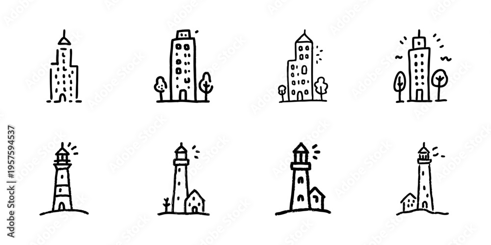 Lighthouse And Skyscraper Icons In Hand Drawn Style Set. Urban And Coastal Navigation Doodle Sketch Collection. Architectural Contrast, City And Sea. Isolated Vector Illustration #1957594537