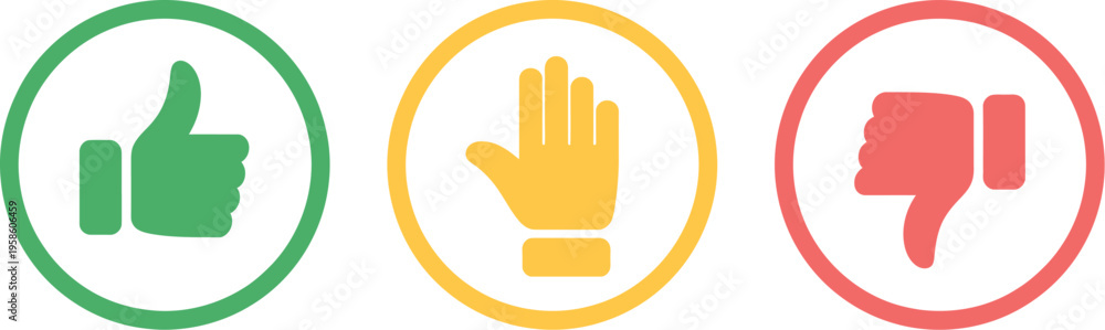 Like, Dislike, and Neutral Thumb Icon, flat outline vector illustration in green, yellow, and red, representing user feedback, rating system, approval, disapproval, and neutral response concept. #1958606459