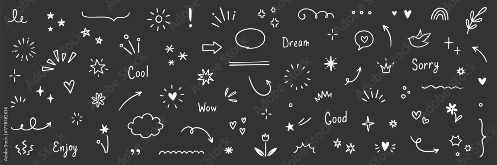 Line arrow, star, heart cute icon elements. Hand drawn sketch heart, arrow, star, flower decoration symbols. Simple sketch line style emphasizes abstract elements on chalkboard. Vector illustration #1778482636