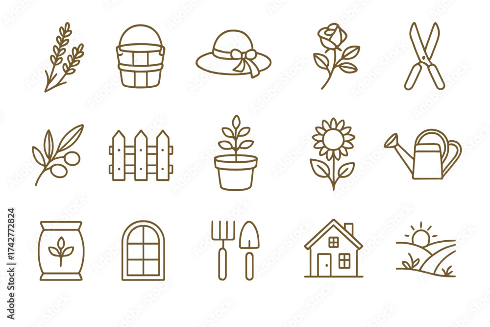 Linear Gardening Icons Set – Flowers, Tools, Plants and Countryside Elements #1742772824