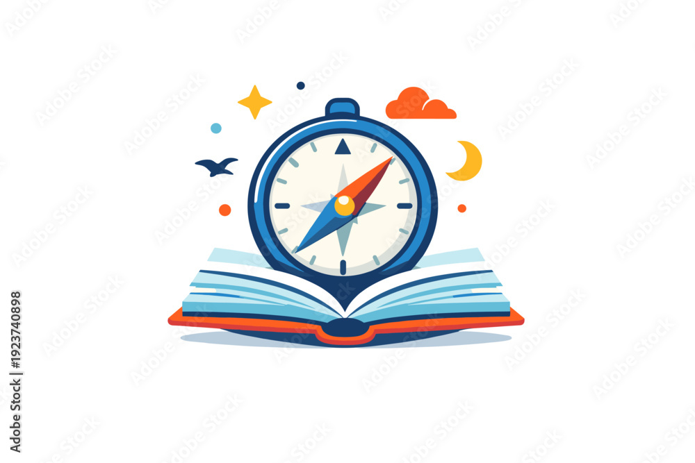Literary journey symbolic scene with a compass emerging from an open book, representing guidance, imagination, and meaningful knowledge #1923740898