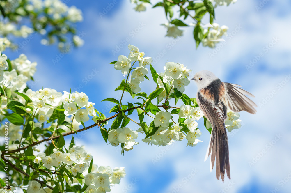 Little bird perching on branch of blooming jasmine. Long-tailed tit. Aegithalos caudatus. Springtime #1940134423