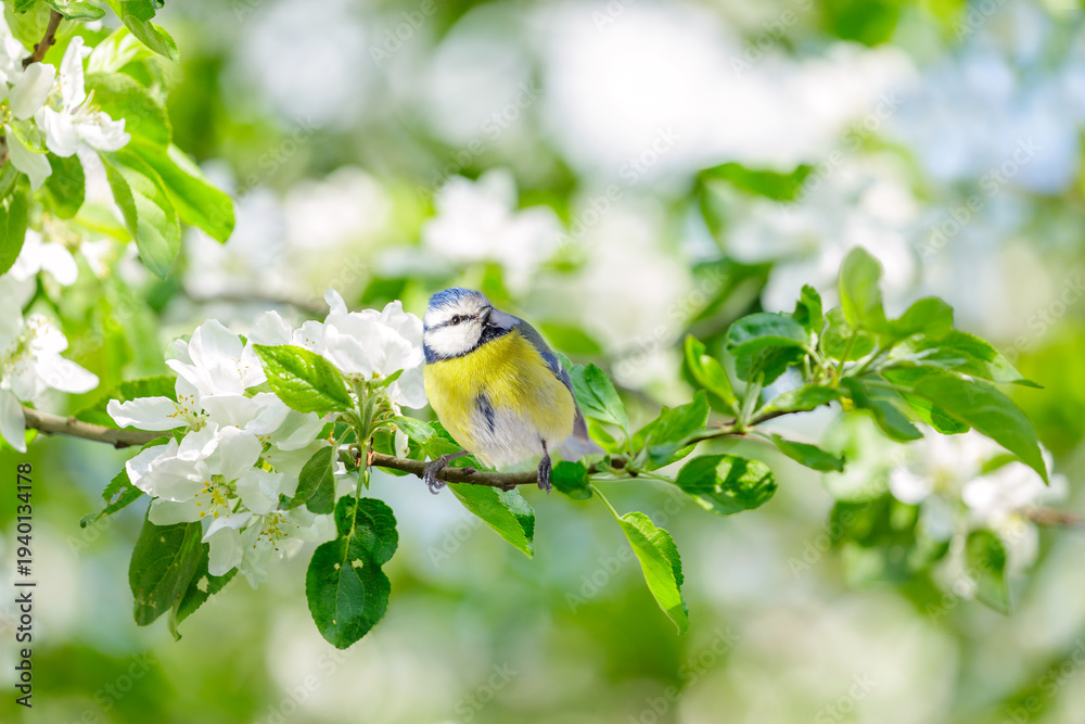 little bird perching on branch of blossom apple tree with white flowers. Blue tit. Parus caeruleus. Springtime #1940134178