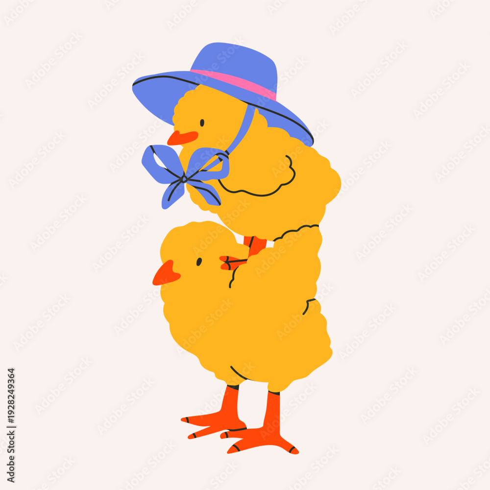 Little Chick in hat stands on another chicks back. Cute characters. Easter symbol concept. Hand drawn Vector illustration. Isolated design element. Logo, icon, print, sticker template #1928249364