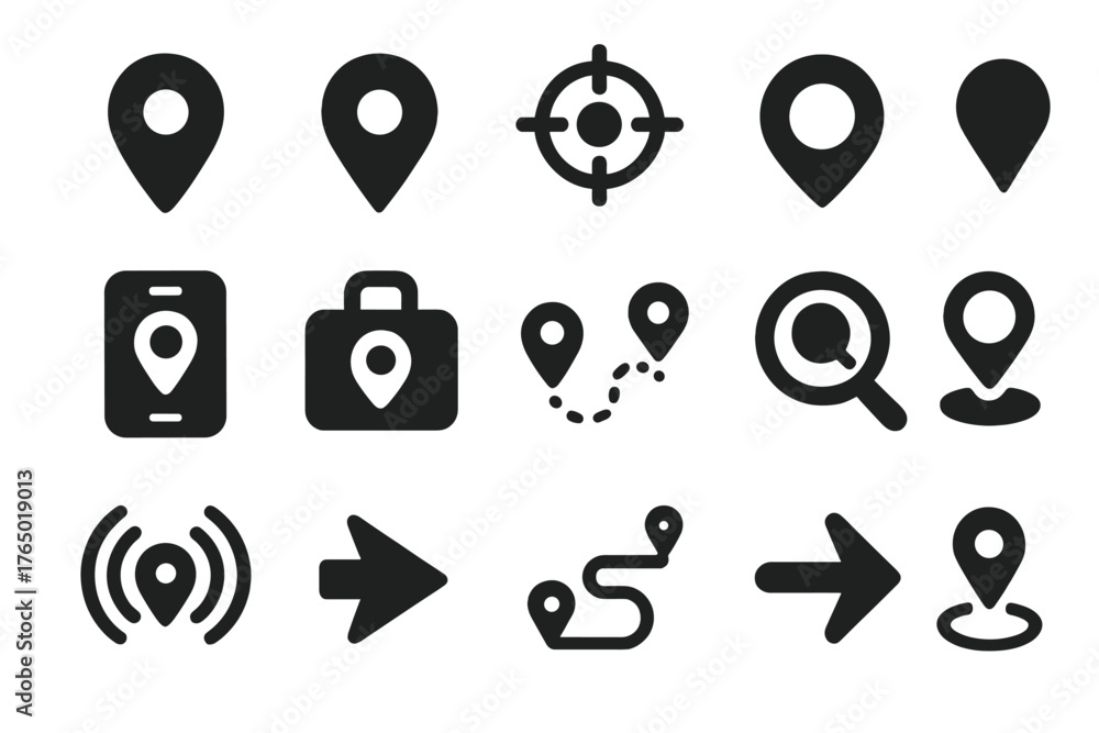 Location Icon Set. Solid style icons of locating objects: map marker, pinpoint icon, GPS crosshair, location dot, find device, #1765019013