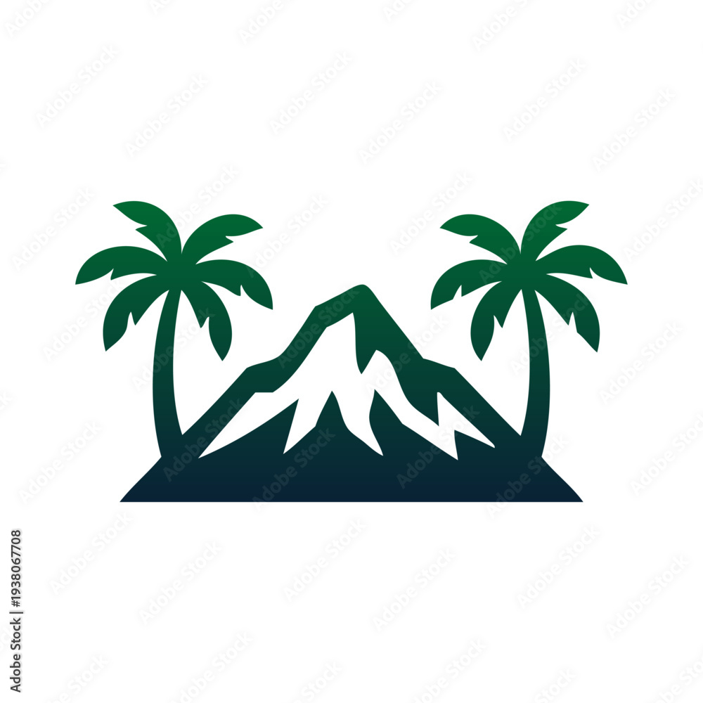 Logo agencia de viajes. Vacaciones de verano. Dibujo sencillo con un paisaje con la palma en una isla con montaña de color degradado #1938067708