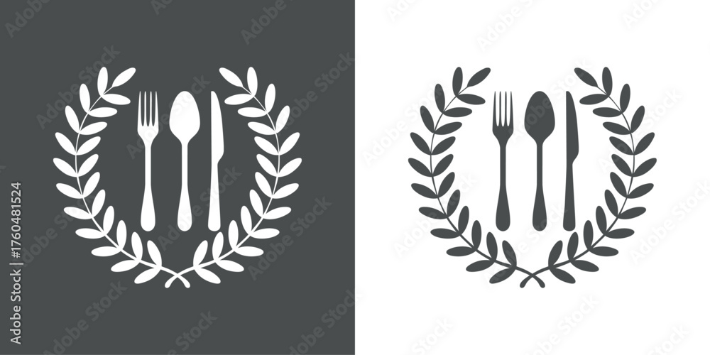 Logo restaurante. Silueta de cubiertos con corona triunfal de laurel #1760481524