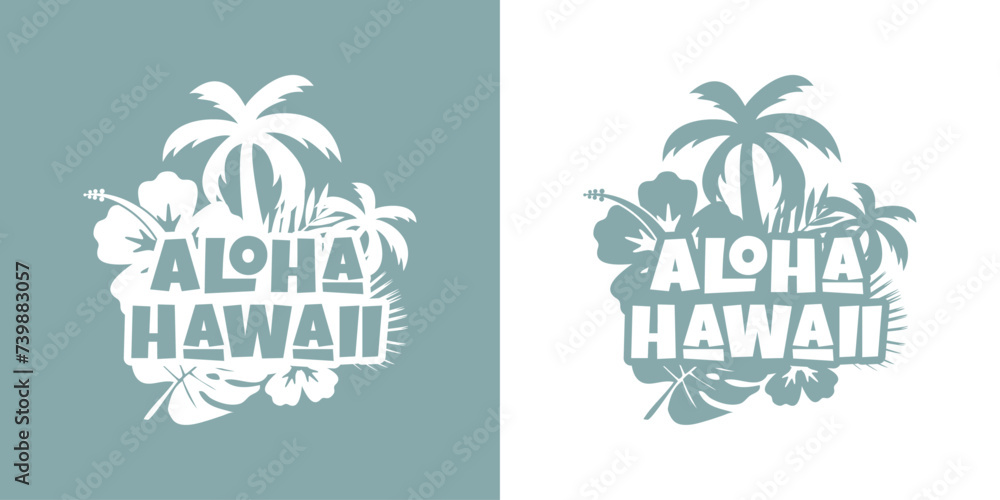 Logo vacaciones en Hawái. Mensaje aloha Hawaii con letras estilo hawaiano con silueta de plantas tropicales #739883057