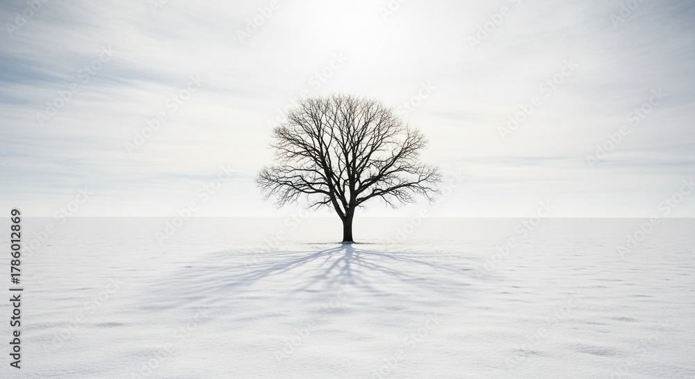 Lonely barren tree silhouette standing in vast snow field beneath soft cloudy sky, representing calm stillness and poetic winter beauty #1786012869