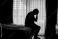 Lonely man silhouette sitting on the bed feeling depressed and stressed in the dark bedroom, Depression and anxiety disorder concept #568634621