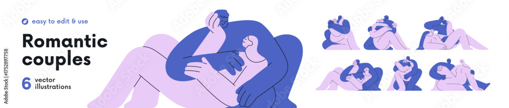 Love couples hugging, embracing set. Intimacy concept. People in romantic relationships, close friends. Intertwined bodies cuddling. Flat graphic vector illustrations isolated on white background #1752897758