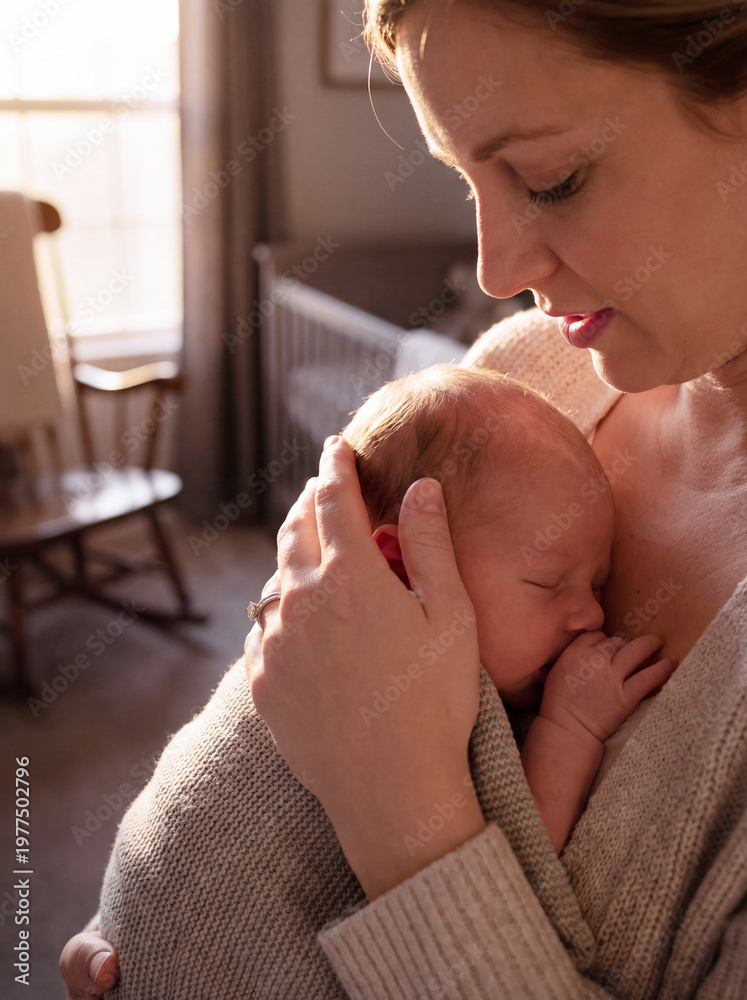loving mother holding sleeping newborn baby in nursery as concept of motherhood infant care bonding and maternal affection at home with soft natural light and cozy nursery interior #1977502796