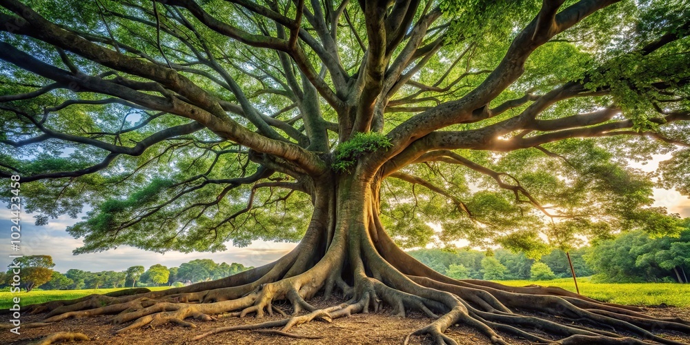 Low angle view of ancient tree with massive trunk and exposed roots #1024423458