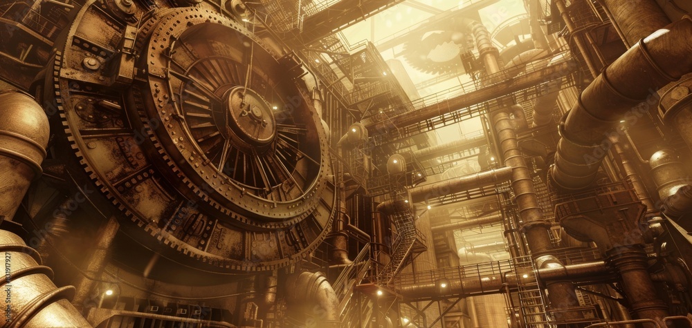 Low-angle view, sprawling manufacturing plant, steampunk aesthetics, massive gears and steam pipes, intricate metalwork, warm sepia tones, detailed and atmospheric, CG 3D render #831917927