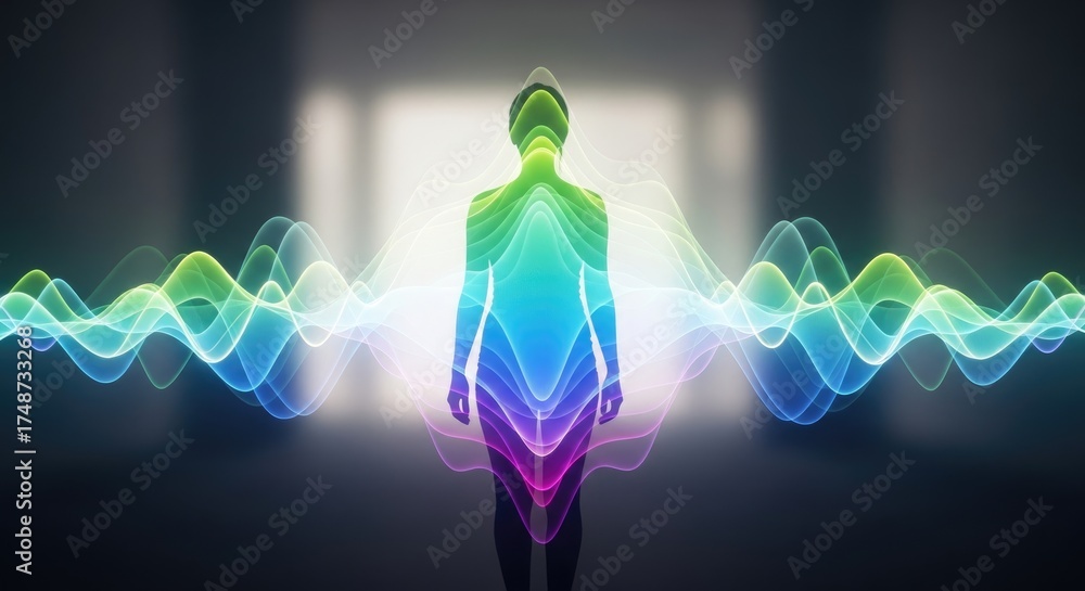 Luminous human energy field radiating vibrant waves of color, symbolizing inner spirit, consciousness, and vital force, abstract wave pattern #1748733268