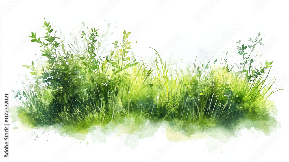 Lush green grass and wild plants in watercolor illustration, evoking nature beauty and tranquility #1172327021