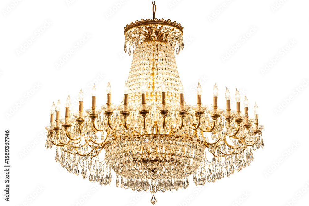 Luxurious crystal chandelier with golden accents and light bulbs isolated on transparent background #1389367746
