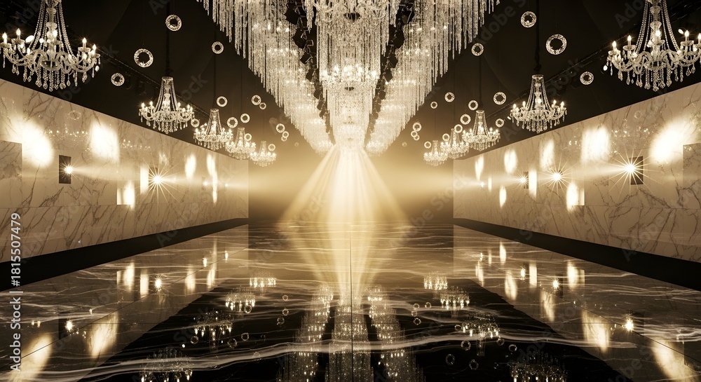 Luxurious grand hallway with crystal chandeliers and reflective floor for fashion show event program background. #1815507479