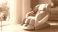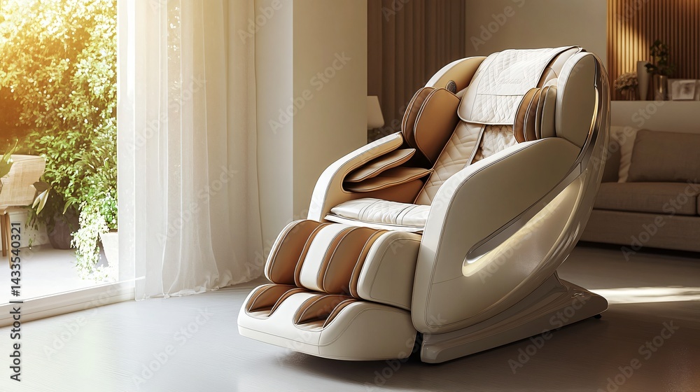 Luxury beige massage chair in a sunlit living room offering relaxation and therapeutic comfort #1433540321