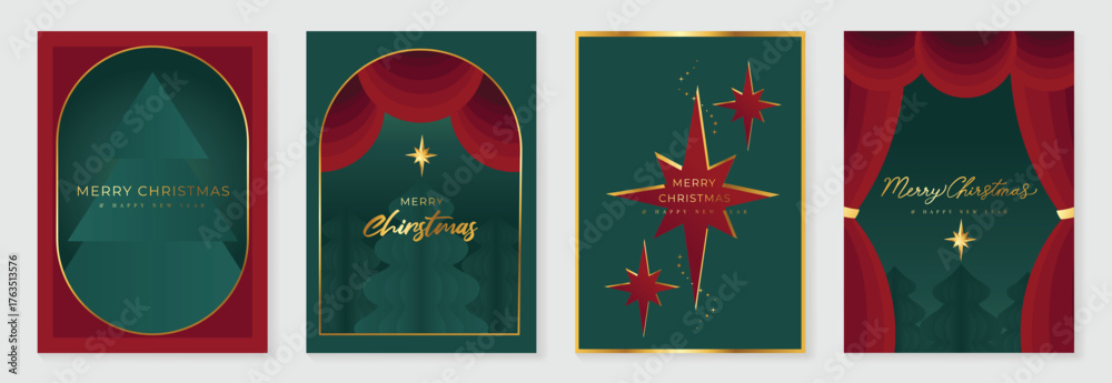 Luxury Christmas Greeting Card Vector Set with Stage Curtain, Star, and Pine Tree in Red and Green Background for Invitations, Posters, Wall Art, Social Media, Packaging, and Holiday Decorations #1763513576