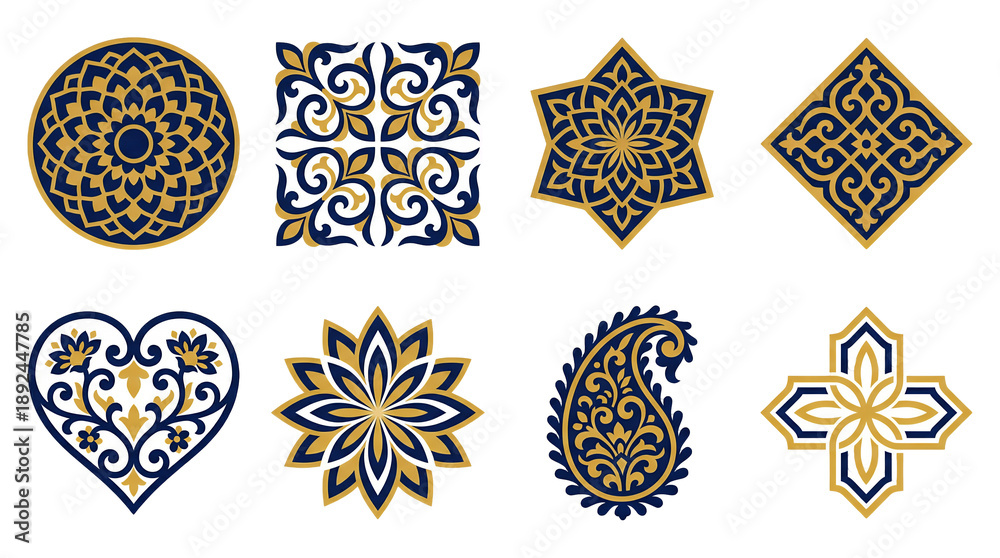 Luxury Islamic ornament set including gold and blue mandalas, stars, paisley, hearts, and floral geometric tiles isolated. Decorative Arabic design elements for Ramadan and Eid. #1892447785