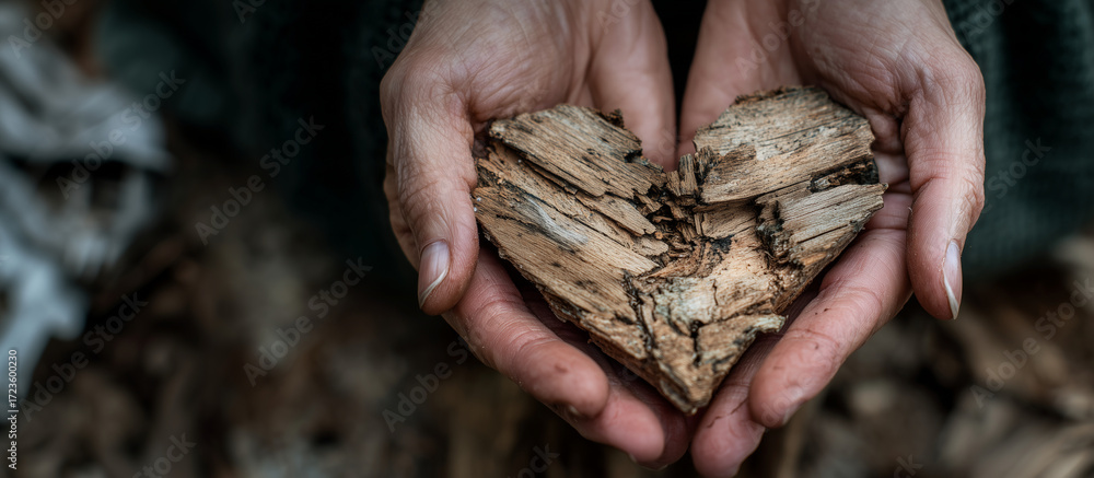 Mãos segurando um coração feito de madeira natural, restos de árvores em decomposição. #1723600230
