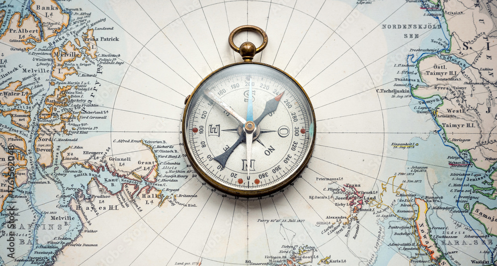 Magnetic old compass on old nord pole map. Travel, geography, history, navigation, tourism and exploration concept background. Retro compass on geography map. #1761562048