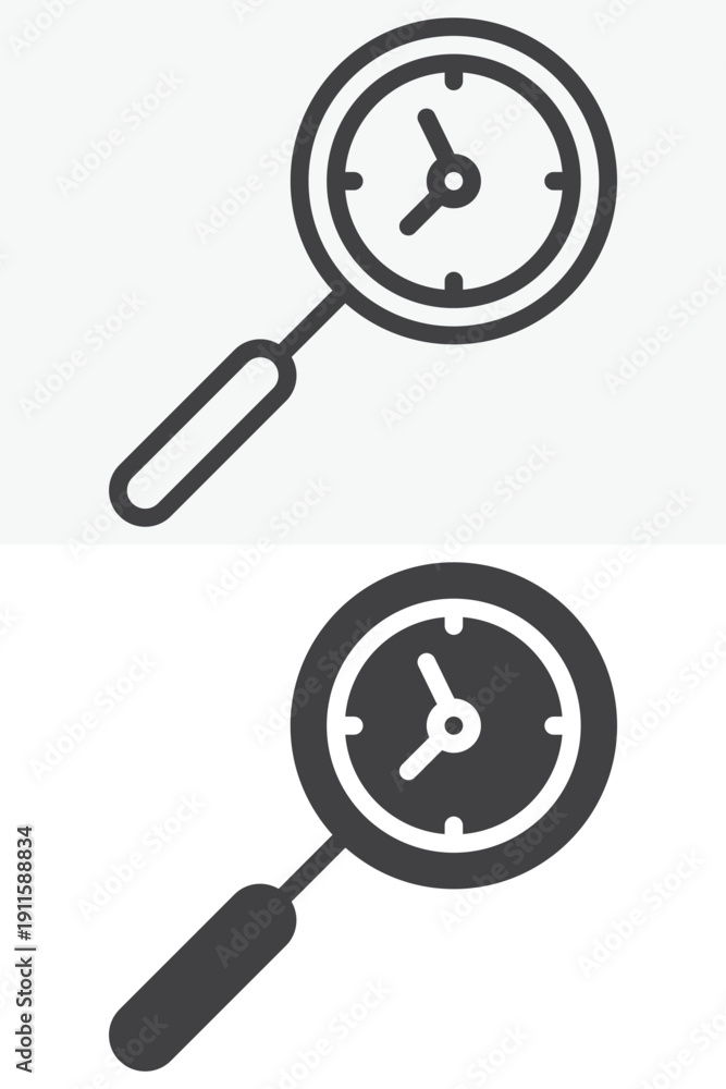 Magnifying glass clock icon set with time search in line, outline and solid styles. Editable stroke vector icon sign, symbol for time tracking and deadline research. #1911588834