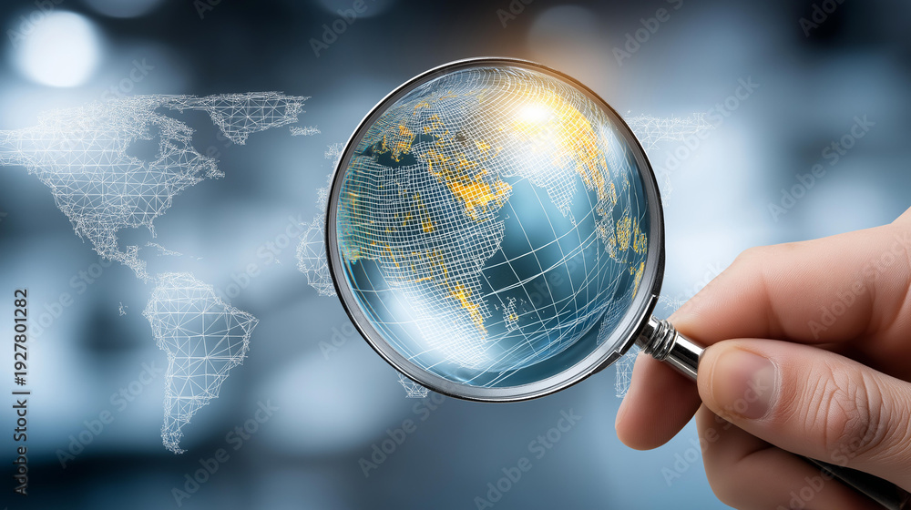 Magnifying glass held over a glowing world map wireframe, global SEO concept, international search engine optimization, worldwide digital marketing, geographic targeting, global online #1927801282