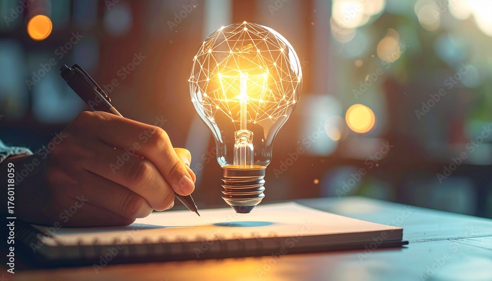 Main écrivant dans un cahier à côté d'une ampoule lumineuse avec un filament géométrique, symbolisant l'idée, l'innovation et la créativité #1760118059